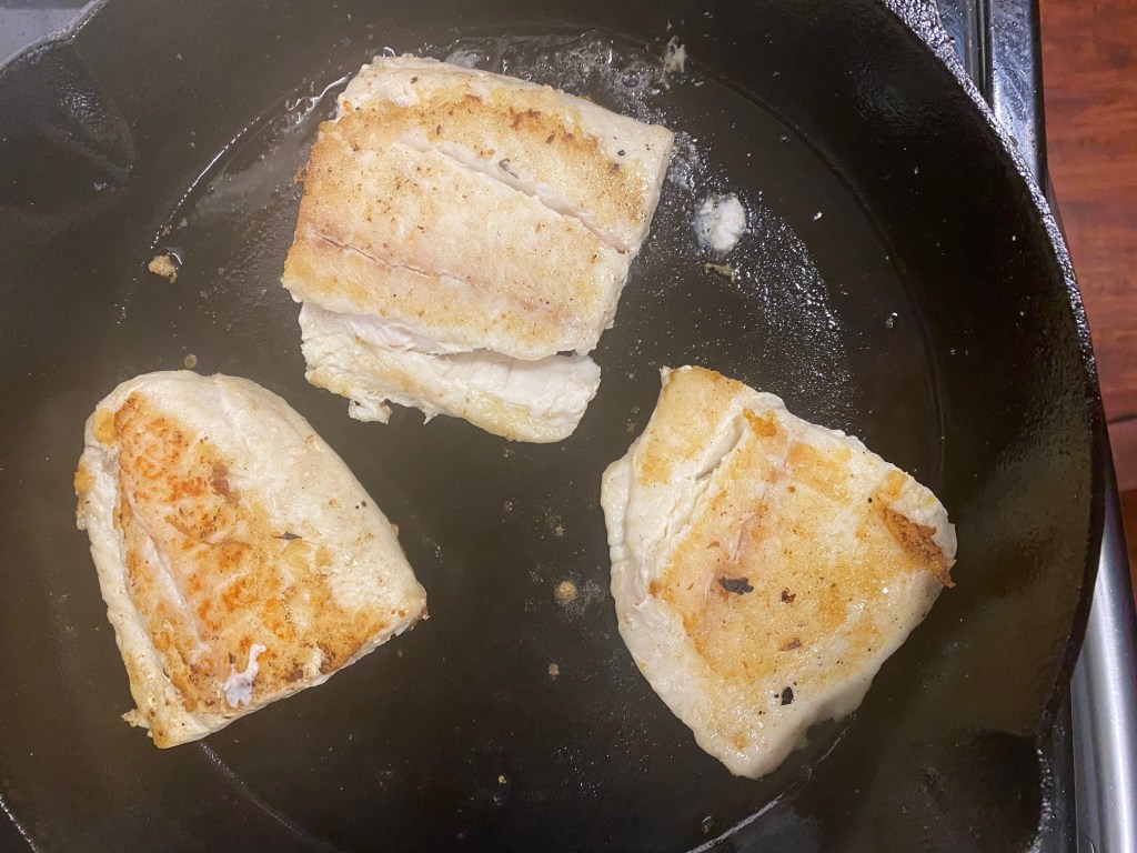 - Brown fish starting skin side down don’t mess with it let it cook until you see a slight browning around the fish once you see this flip fish and brown on the other side. (* Tip if your fish doesn’t flip easily it’s not ready give it time)