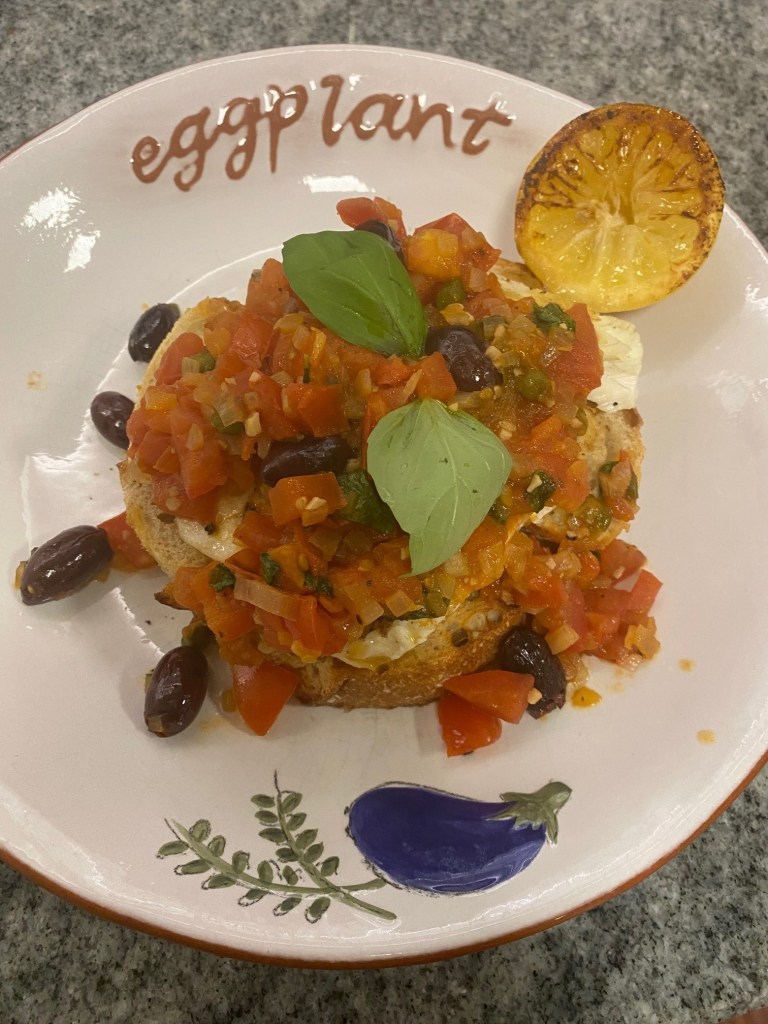 - Place fish on top of crusty bread and top with puttcanseca sauce tear fresh basil on top of sauce and serve with charred lemon