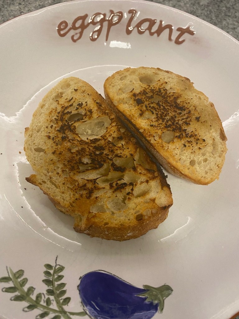 - Brush bread with olive oil and toast in pan until crusty ( you can do this in the oven but I like the char it gets form the cast iron skillet. Remove and place on serving plate